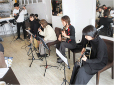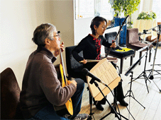 「今年1年良い年になるよう祈念して」乾杯した後、ランチブッフェを楽しんでいただきました。皆さんのお食事中、デュオ・ササイによる生BGM演奏タイムです。 今回は二胡&ギターの演奏を行いました。皆さんのお腹が程よく満たされた頃、お楽しみ抽選会を開催!景品は私があちこち出かけた先で買ってきたお土産を大放出しました。 最後は有志の皆さんによる余興ミニ・ライブです。くじ引きで決まった演奏順に演奏を披露していただきました。ソロあり、グループあり、歌あり、インストあり、 バラエティ豊かな演奏で盛り上がりました。 ご参加の皆さんに楽しんでいただけたら幸いです。会場のスタッフさんにも大変お世話になりました。ありがとうございました。 |