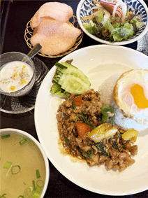 そちらに行ってみました。 お店に入ってみると、現地の方らしき御夫婦とおぼしき店員さんが調理とホールを二人で切り盛りしていました。 ランチセットのメニューは、パッタイやカオマンガイなど種類豊富に取り揃えていました。まずはガパオライスセットから! 甘辛いガパオライス、あっさりスープ、ソーセージが入った食べごたえのあるさっぱりサラダ、えびせん。 なぞの白い液体は、、、ココナッツミルクにタピオカとコーンが入った、おかずとデザートの中間のような一皿でした。 美味しかったです♪次はカオマンガイも試してみたいです。 |