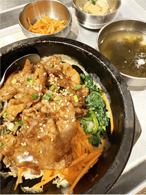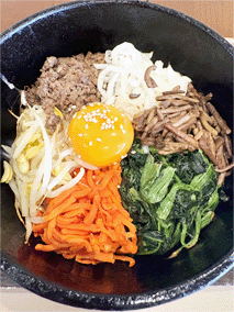 石焼ビビンバ到着〜♪店員さんに「卵をかけていいですか?」と聞かれたので「お願いします!」と答えました。熱々に熱された石鍋の縁に溶き卵が注ぎ込まれ、 ジュ〜っと美味しそうな音が響きました。味噌がお肉に絡ませてあって、混ぜると全体に味噌味が行き渡るというスタイルでした。 豚の焼肉がどーんと盛り付けられて、その下にナムルが沢山敷き詰められていました。キムチもおかずもスープも、もちろんビビンバも全部美味しかったです♪ 寒くなったらチゲを食べに行きます! |