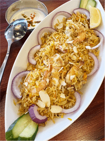 テーブルに案内されまして、メニューを見てみました。ランチメニューも沢山ありますが、グランドメニューもドリンクも豊富です。 最近ハマっているビリヤニを単品でいただくことにしました。ビリヤニのメニューがなんとチキン、マトン、エビと3品から選べるようになってました。 ビリヤニはタンドリーチキンが埋め込まれているものだとばかり思っていました。違うのもあるんですね! 珍しいのでエビのビリヤニにしました。ヨーグルトをサラダとしていただいたり、ソースにしてビリヤニにかけてみたり。 美味しくいただきました。また他のメニューに挑戦してみたいです♪ |