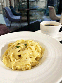 パスタ・ランチが数種類あり、カルボナーラをチョイス。最初からドリンクがセットになっていて、ホットコーヒーにしました。 坪庭が見える場所に着席。しばらくしてカルボナーラとコーヒーが運ばれて来ました。太めの平打麺でもっちりとした食感と小麦の香りで美味しいです。 麺が短めにカットされていたので、口の中がいっぱいになりすぎなくて食べやすかったです。コーヒーは私好みの酸味少なめ。 落ち着いた空間で仕事もはかどりました。雰囲気の良いカフェが出来ていて嬉しかったです。 |